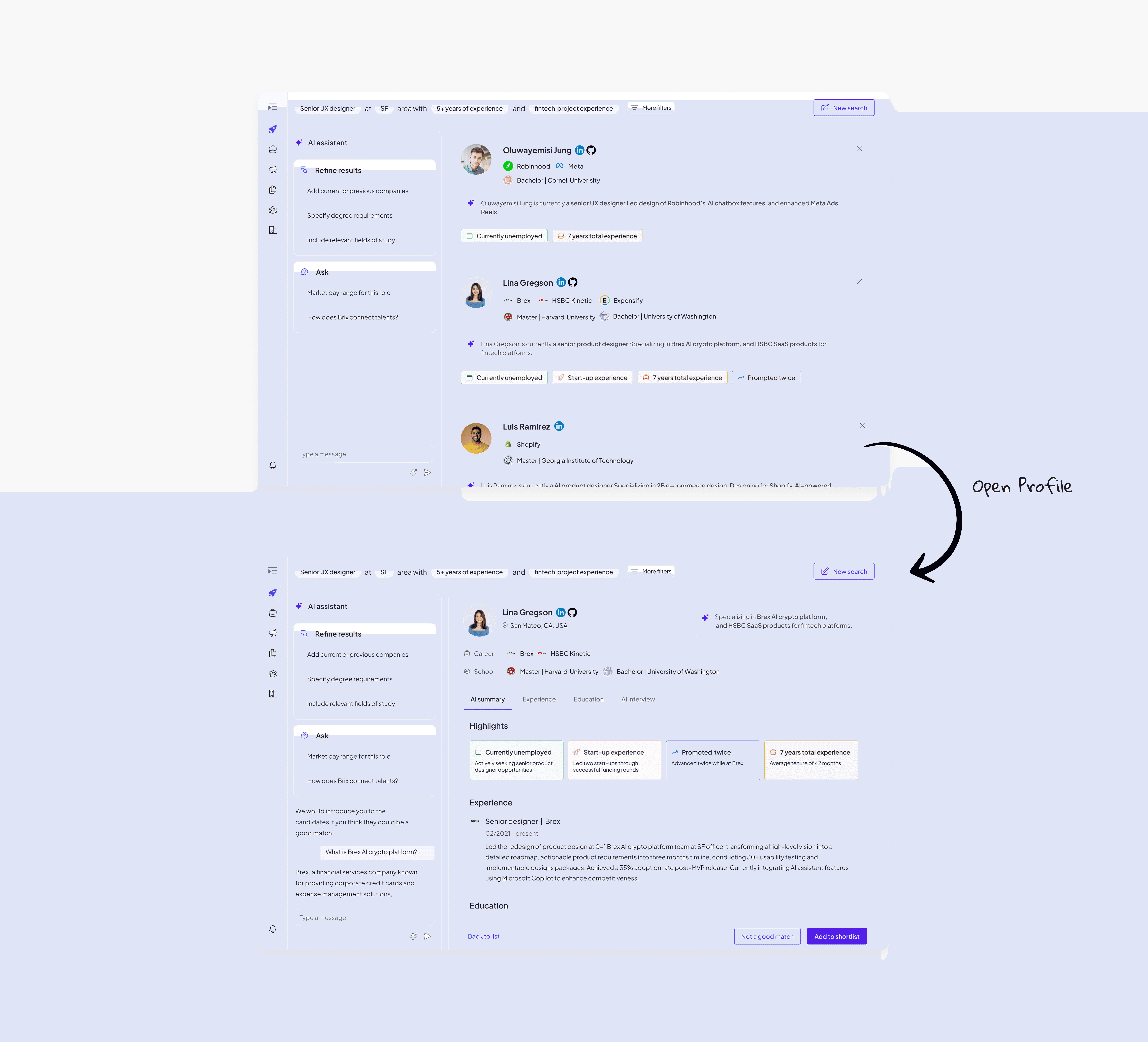 We started with candidate screening redesign, but the real breakthrough came when Brix evolved into an AI Agent — capable of generating reports, running searches, and automating outreach. This second phase became the foundation of our design impact.