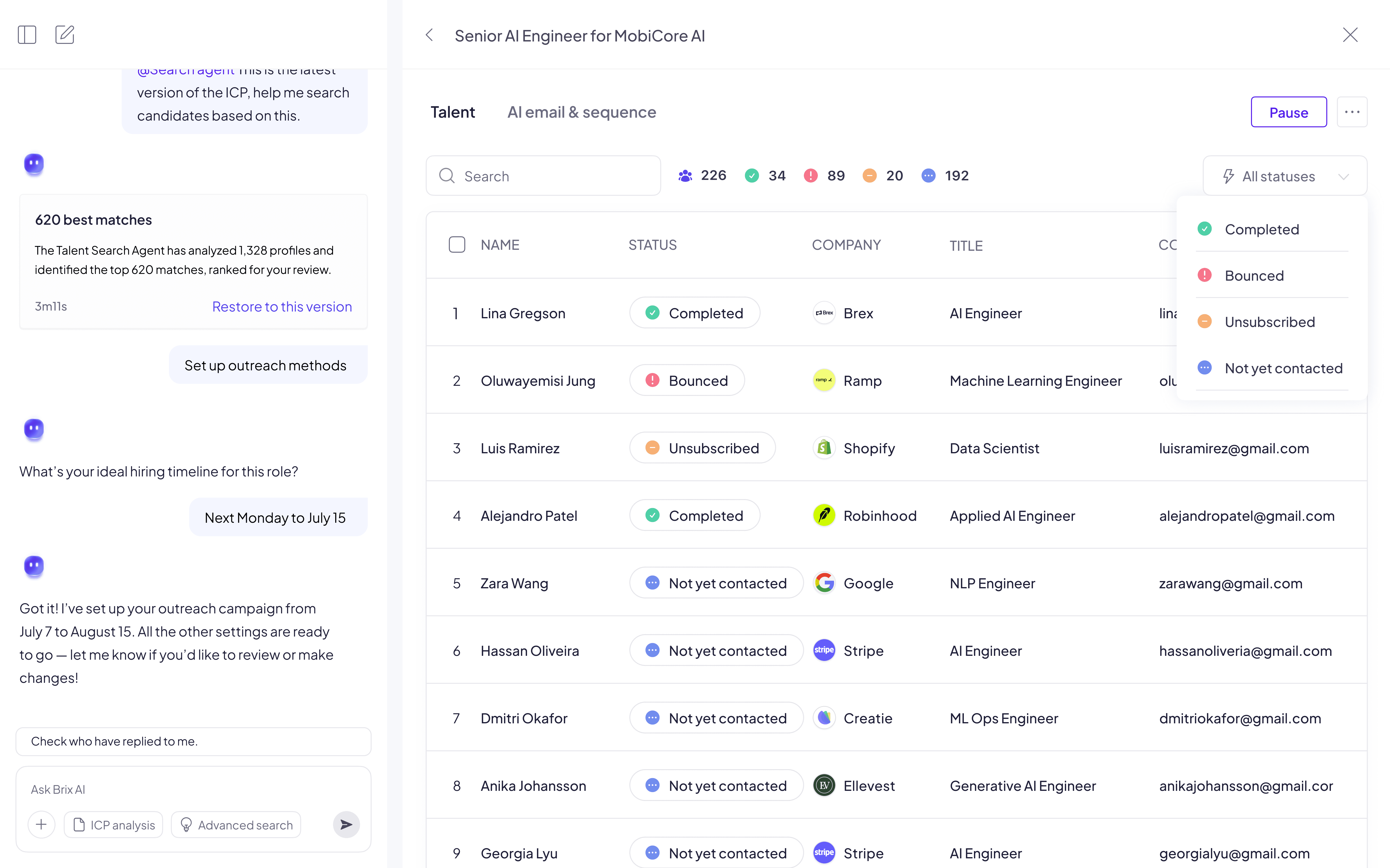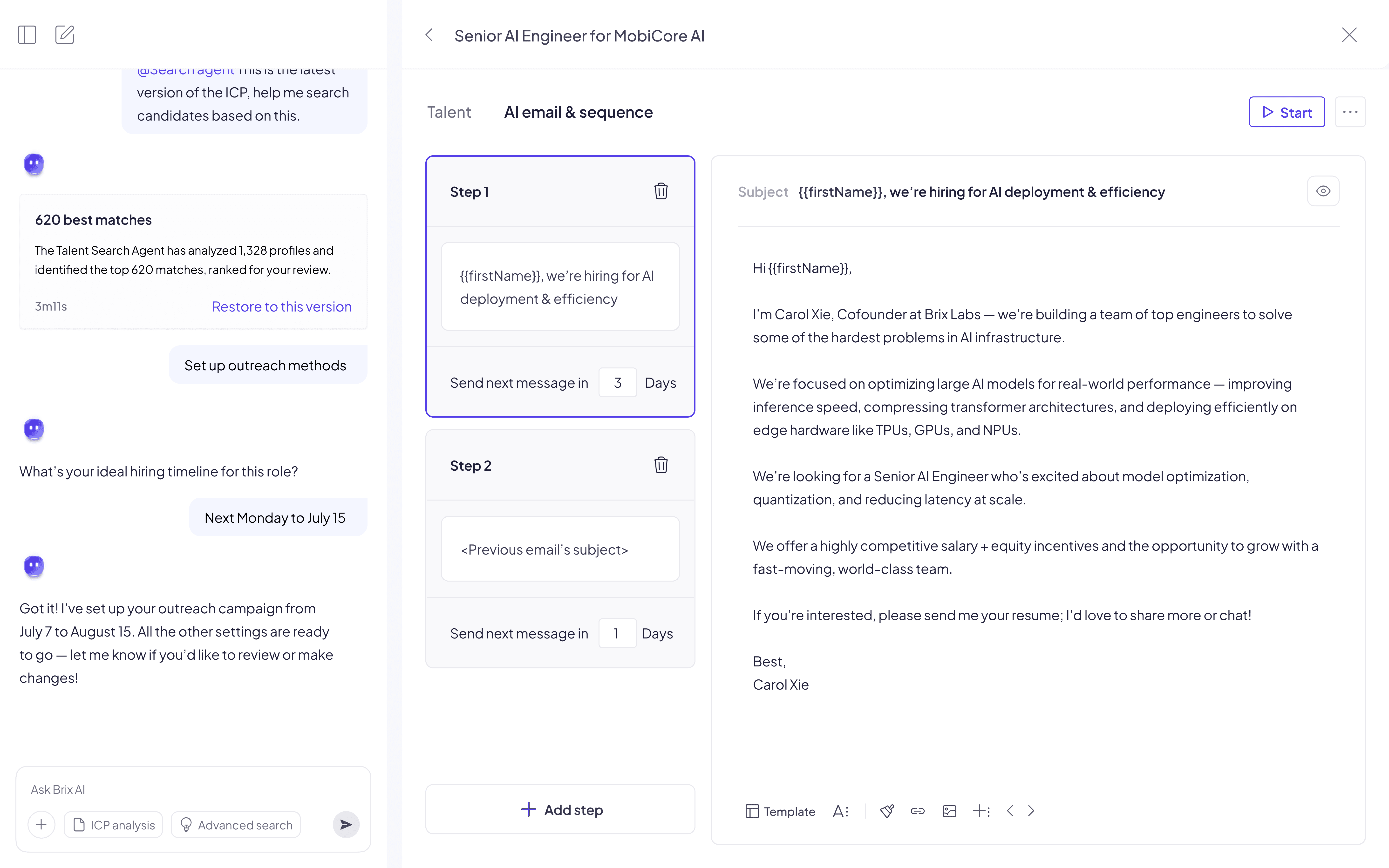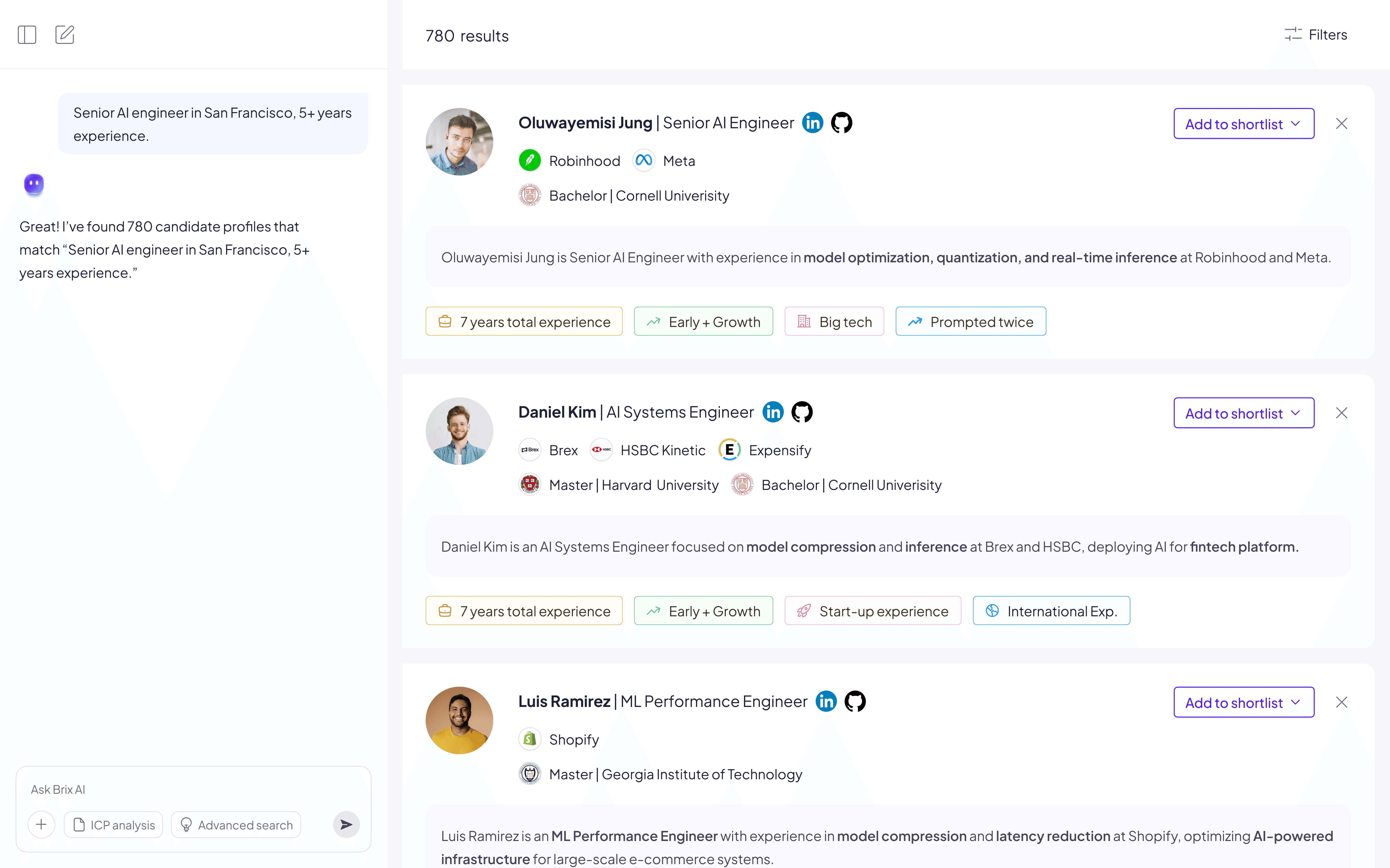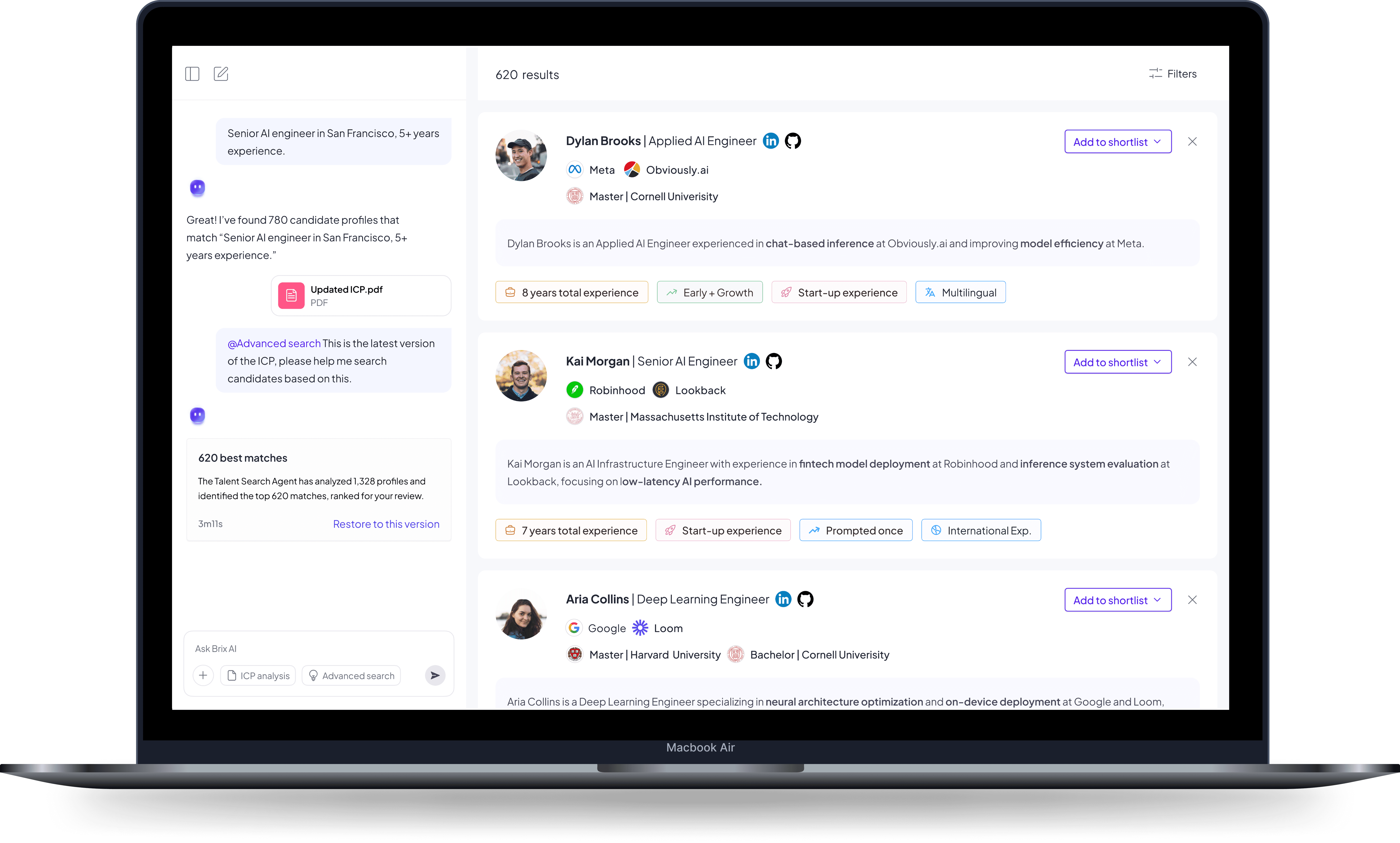 Brix started as a tool to help candidate screen candidates faster and with more clarity tool. As it shifted toward an AI Agent, we redesigned the user experience to match new capabilities. User research led us to add features like ICP analysis, grounding the AI in real hiring needs.